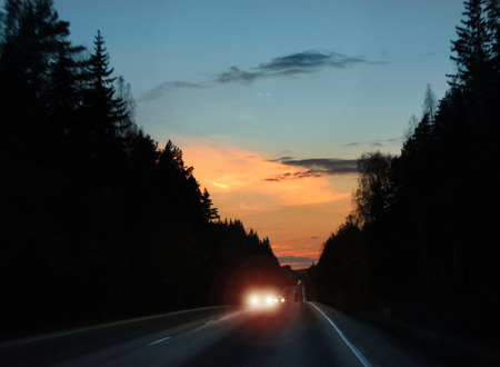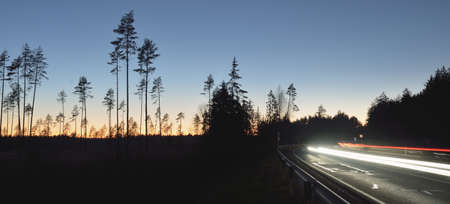 Highway through the evergreen forest at sunset. Dark silhouettes of mighty pine trees. Clear sky. Motion blur effect. Atmospheric landscape. Nature, road trip, remote places