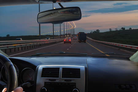 Driving on a highway at sunset. View from inside the car