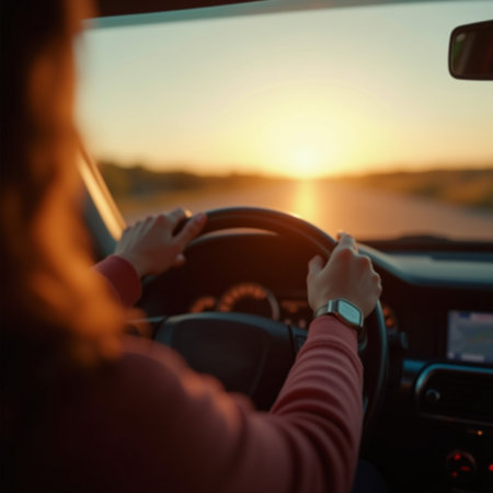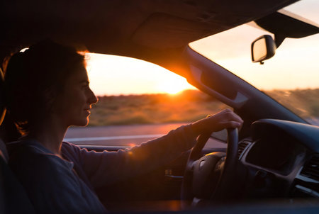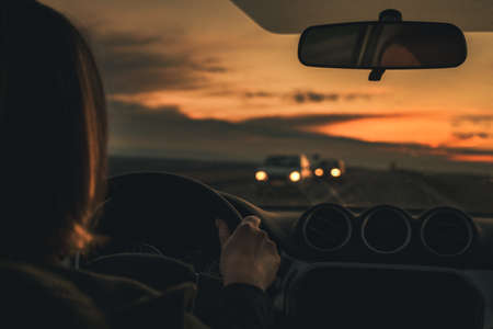 Woman driving a car at sunset. View from the driver's seat.
