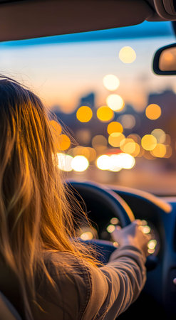 Woman driving car in dusk, selective focus and shallow depth of field