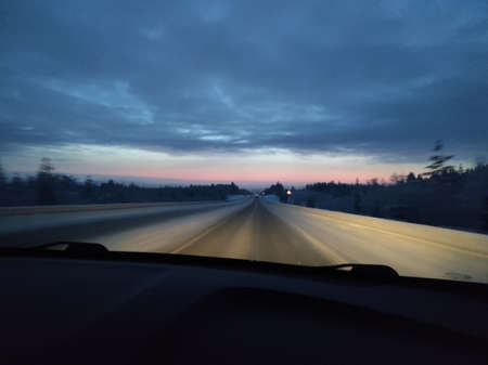 Highway at dawn. Point of the vehicle on the road.