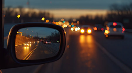 Rearview mirror reflecting the last light of the day, with the highway disappearing into the evening glow.