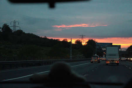 Sunset view from a car on a busy highway