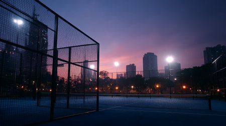 Sunset sports court view in city with glowing lights and tall buildings at dusk