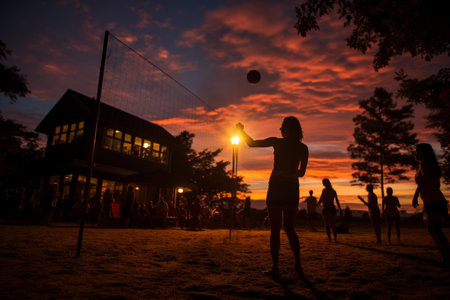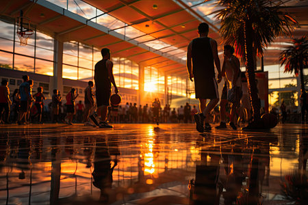 A serene sunset scene capturing silhouettes of people walking along the shore with a basketball hoop in the background, showcasing leisure and beauty.