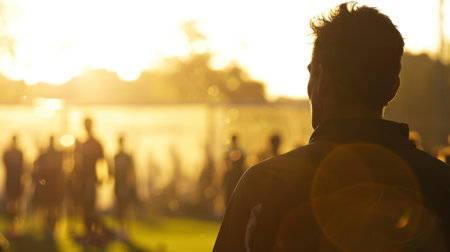 Football players in jerseys watch sunset from the sidelines. Silhouettes and golden hour light