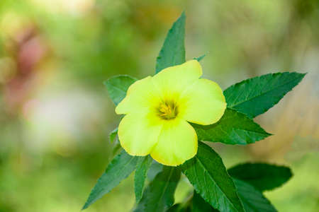 Yellow Evening Primrose on the dark green leaves backround