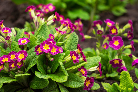 Beautiful violet flowers of primula with juicy green leaves grow in ground close up. Many small purple plants in macro. Background from group of little blooming primroses.