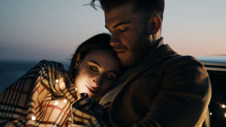 Romantic young couple in love embracing and kissing on a balcony at sunset with lanterns.