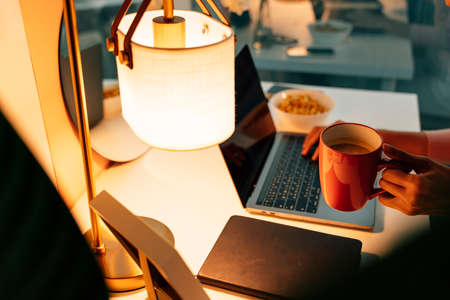 Woman working on laptop and enjoy coffee and snack for dinner at home.