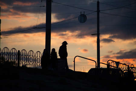Silhouette of people and photographers on mountain at dawn. Silhouettes of people against the night sky. After a decline.