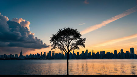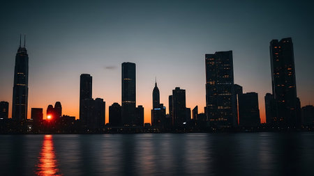 Illuminated skyscrapers dominate the cityscape, casting a warm glow against the serene waters at dawn. Ai generated image