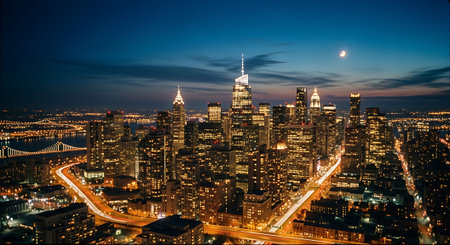 Aerial view of a city skyline at dusk with illuminated skyscrapers and a moonlit sky