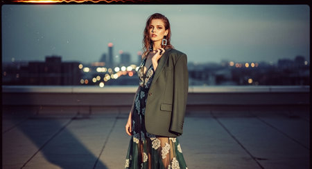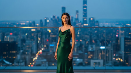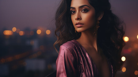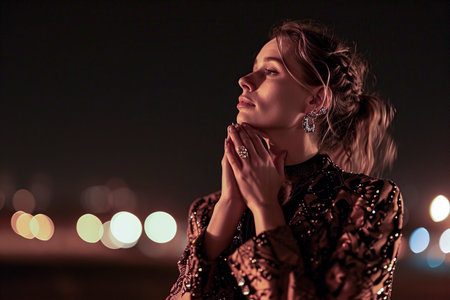woman in elegant attire, posing against a backdrop of distant city lights at night
