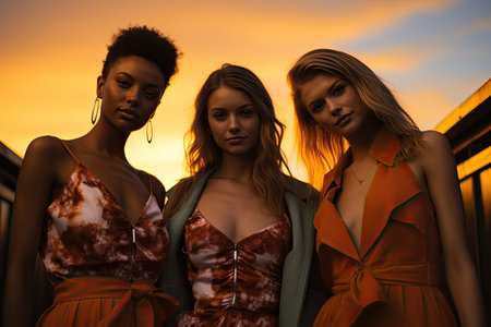 Three beautiful multiethnic women posing outdoors at sunset.