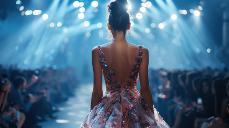 Fashion model gracefully walking down the catwalk in an elegant dress, captivating the audience during a glamorous fashion show event