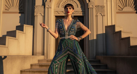 A confident woman in a stylish outfit poses dramatically in low light, showcasing elegance and sophistication