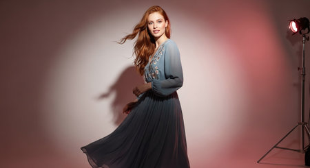 Beautiful young woman in long dress posing in studio. Studio shot.