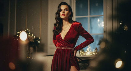 A glamorous woman in a red velvet dress, posing elegantly in a softly lit room with festive decorations