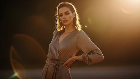 A woman in a shimmering golden dress poses gracefully against a beautiful sunset field background.