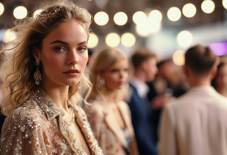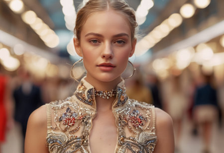Elegant model walking the runway in designer attire. Her poised expression and ornate outfit captivate onlookers.
