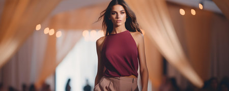 Stylish Model Commands the Runway at a Fashionable Event with a Blurred Background and Ample Copy Space, Against a Solid Background - a Relaxed Sense of Stealth. Concept Fashion Runway