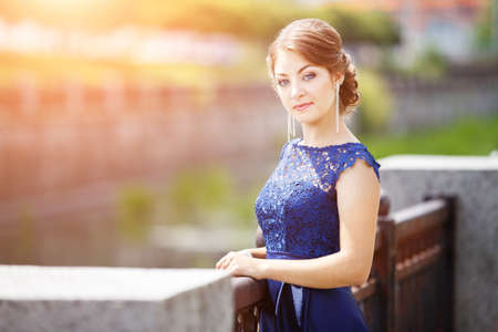 Portrait of beautiful young woman stand on terrace in lavender evening dress. Elegant makeup