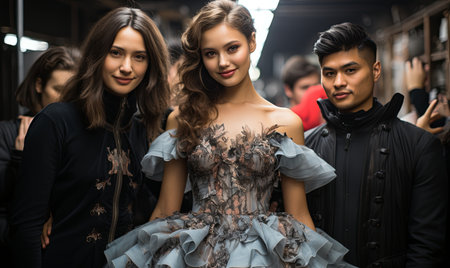 Fashion designer giving instructions to models during preparations for a runway show, in a backstage environment