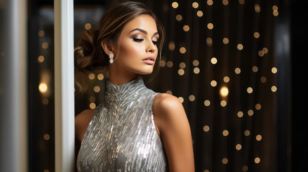 Beautiful woman curly hair Silvery dress luxury