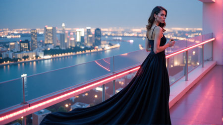 A stylish woman stands on a rooftop terrace wearing a black evening gown that hugs her silhouette. She holds a glass of champagne, gazing at the vibrant city lights below as dusk settles in.
