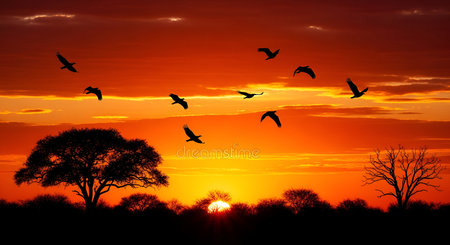 Silhouettes of birds are captured in mid-flight against a vibrant orange and red sunset sky. The scene depicts a typical African savanna landscape with silhouetted trees and bushes along the horizon. The sun is low, casting a warm glow and dramatic clouds.