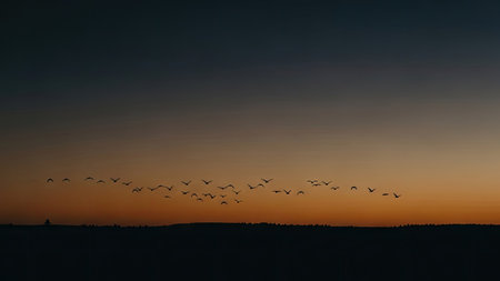 A flock of birds is silhouetted against a vibrant sunset. The composition showcases a fiery gradient of orange and red hues in the sky. The image has a painterly style with diffused lighting and an atmospheric perspective. Suitable for various editorial and commercial applications.