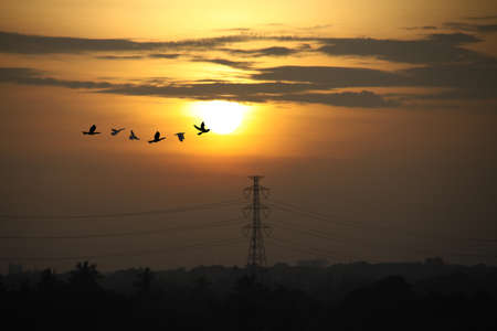 Sunrise in morning with high voltage poles and beautiful bird flying pass