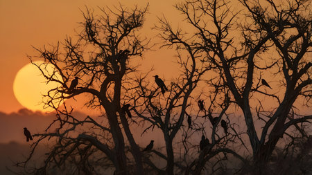 Birds colony during sunset