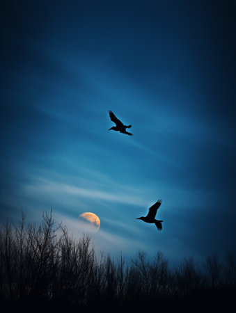 Generative AI : Migratory birds flying in the sky with full blue moon Elements of this image furnished by NASA