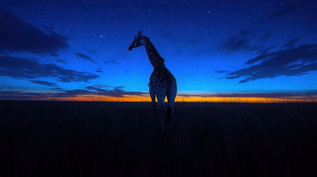 Giraffe in Blue Hour - A solitary giraffe standing under twilight skies, deep blue tones, faint stars emerging, moody and cinematic, long shadow casting