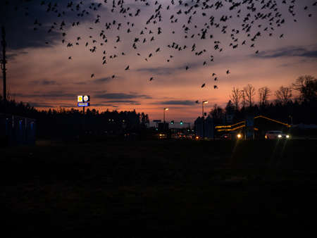 Frankfurt, Germany. Autumn, 20016. Twilight panorama with flock of swallows flying over highway in Germany.