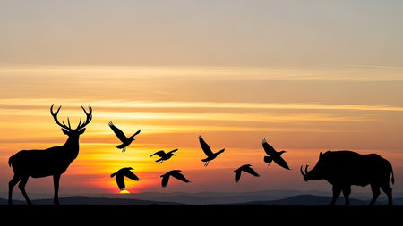 Silhouette of wild animals at sunset with birds flying in the sky