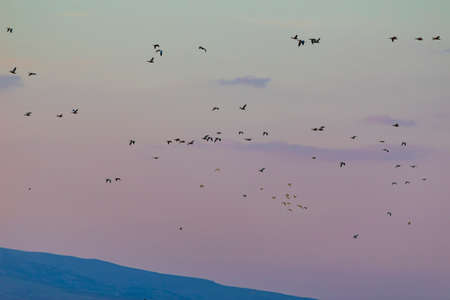 Birds (Common crane) against the background of the mountains in the evening. The Hula Valley in northern Israel at sunset. Artistic gradient color