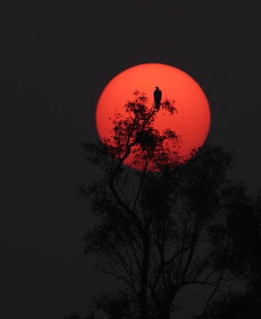 Landscape of Africa with warm sunset, beautiful nature, dramatic red sky, silhouettes of big Ibis birds, wildlife safari, Eco travel and tourism, South Africa, Kruger national park, Sabi Sand