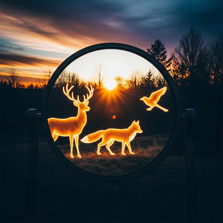 Deer silhouette in a round mirror on the background of the setting sun