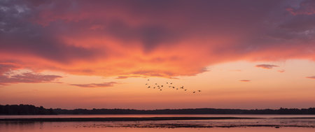 Sunset over a lake with birds flying in the sky. Panorama