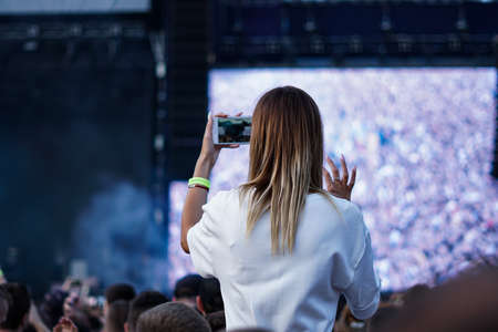 People taking photographs with touch smart phone during a music entertainment public concert. live concert, music festival, happy youth, luxury party, landscape exterior. Selctive Focus