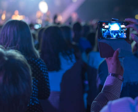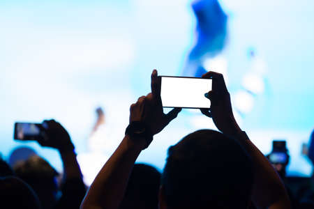 Using a smartphone in a public event. Holding a mobile phone in hands and shooting photo or video content.
