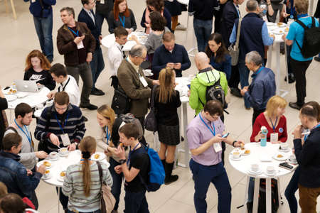 Moscow, Russia - April 15, 2017: Visitors have a lunch in a cafe at coffee break at Velocongress.