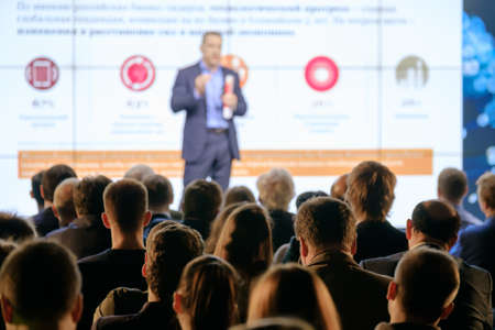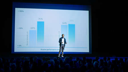 Startup Conference Stage: Speaker Presents New Product, Talks about Performance, Neural Networks, Artificial Intelligence, Big Data and Machine Learning. Live Event with Large Audience