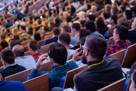 Software engineer in black t-shirt sitting in conference hall during programming worshop in full hall with audience learning programming