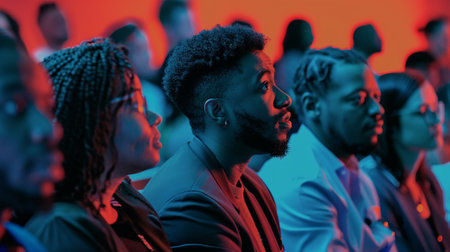 Gathered crowd in a contemporary conference center, a focused attendee uses a smartphone to capture a presentation happening on stage while others engage in the event.