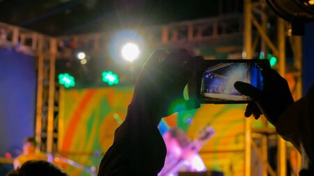 Smartphone camera video photo recording. Live concert by night. Horizontal