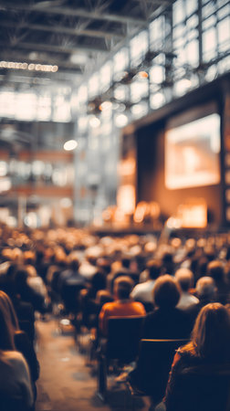 Blend in professionalism! A blurred background of a business conference and presentation, showcasing the dynamic atmosphere of a corporate event and the engaged audience